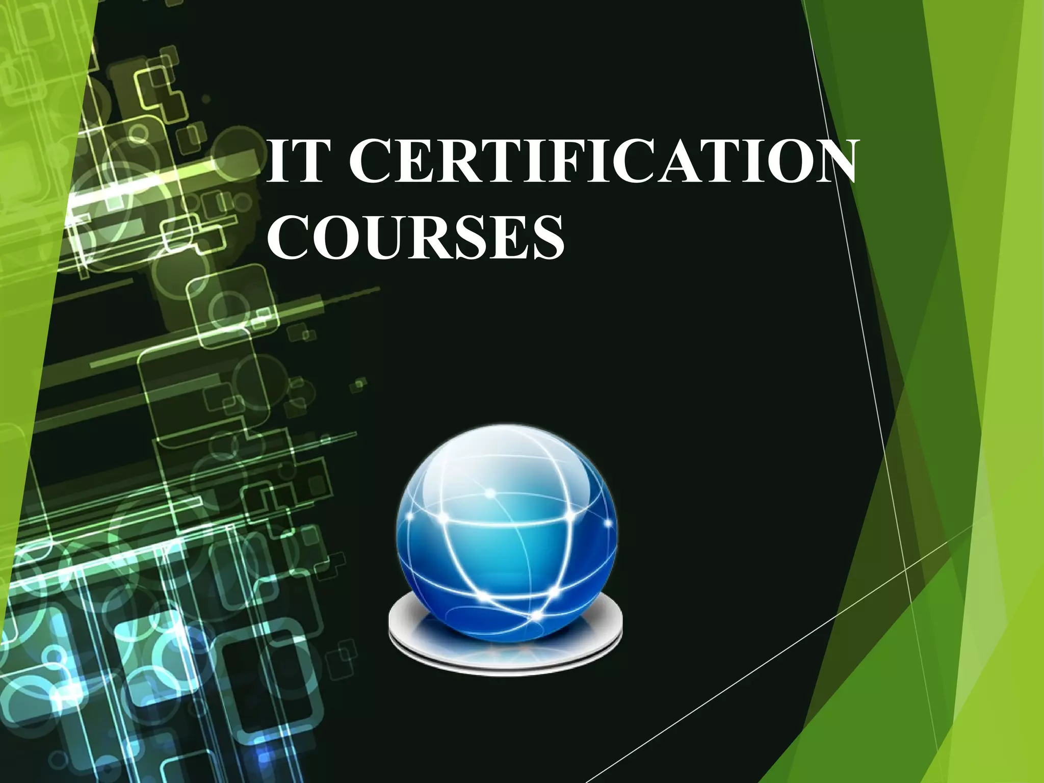 This document discusses IT certification courses and their importance. It begins by defining certification and its meaning. It then discusses the need for certification to prove skills and knowledge. The document outlines different categories of certification courses, including networking, database, and programming certifications. It provides examples of basic, intermediate, and advanced networking certifications. It also lists some of the top certifications in today's IT world, such as RHCE, Oracle, Security+, CCNA, and MCSE. The document concludes that certifications are important for securing a better job and future in the competitive IT industry.