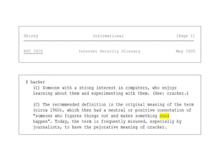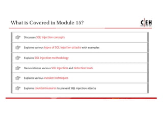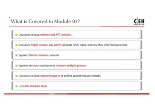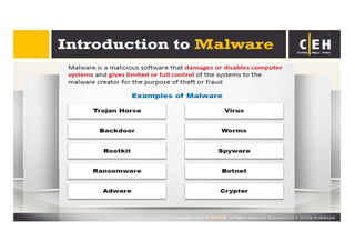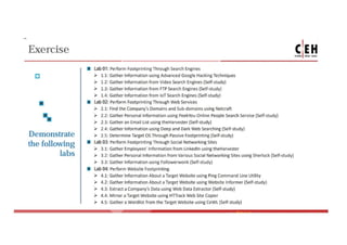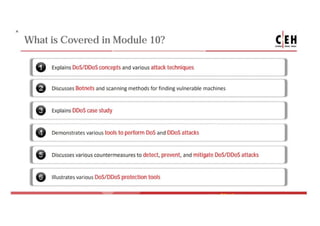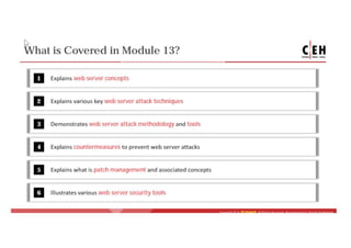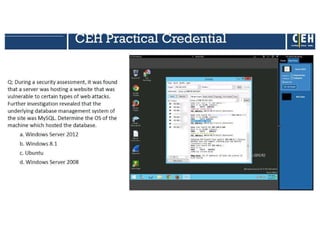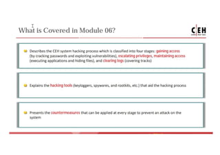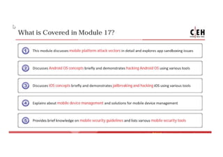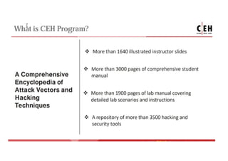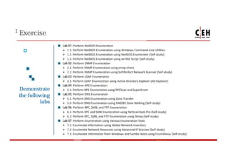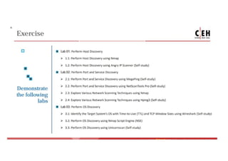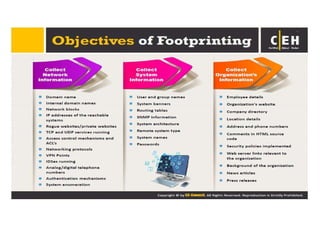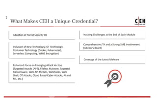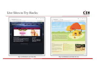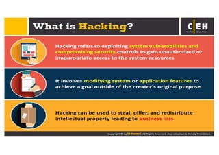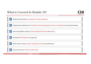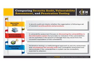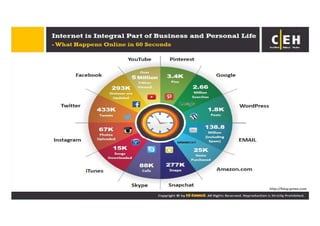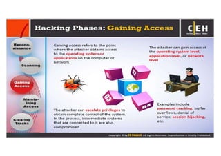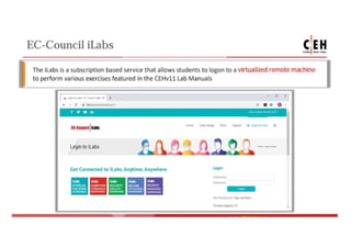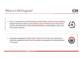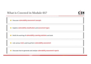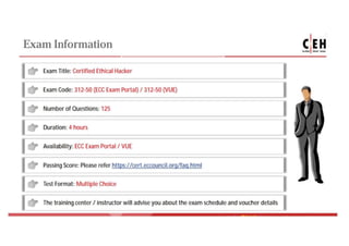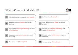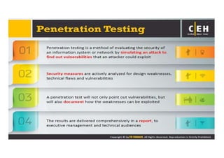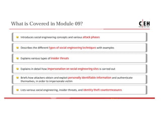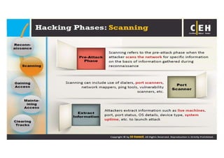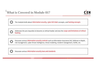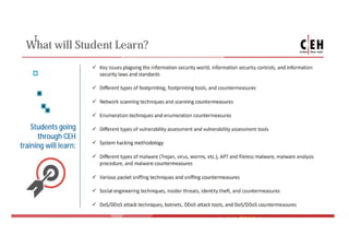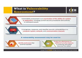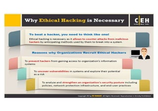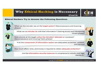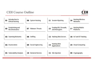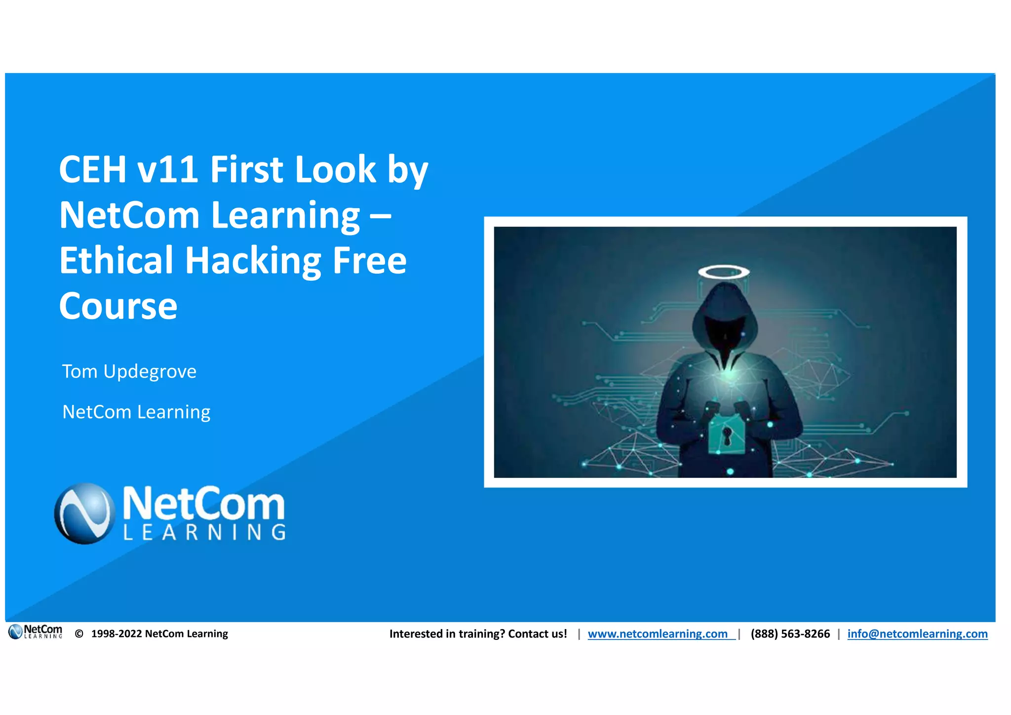 The document provides an overview of a free ethical hacking course offered by Netcom Learning, presented by Tom Updegrove. It covers topics such as the phases of ethical hacking, the differences between network and web browser attacks, and responsibilities for data in the cloud. Additionally, it includes information on vulnerability assessments and penetration testing.