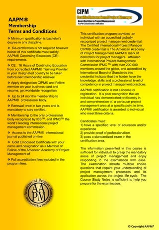 The document outlines the Master Project Manager (MPM®) certification program offered by the American Academy of Project Management (AAPM), which requires specific educational and experiential prerequisites. The 32-hour IT Project Management program integrates project management principles with the system development life cycle, preparing participants for various IT project roles through a comprehensive curriculum. The certification includes a final examination and covers all phases of managing an IT project, from initiation to implementation.