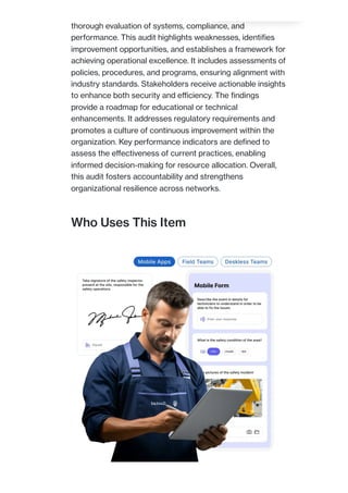 The certified network and programs audit facilitates a thorough evaluation of compliance, efficiency, and operational effectiveness, providing actionable insights for improvements and regulatory adherence. Stakeholders including network administrators and compliance officers can leverage the findings to enhance performance and security within their organizations. The audit fosters a culture of continuous improvement, optimizing operations and ensuring accountability across networks.