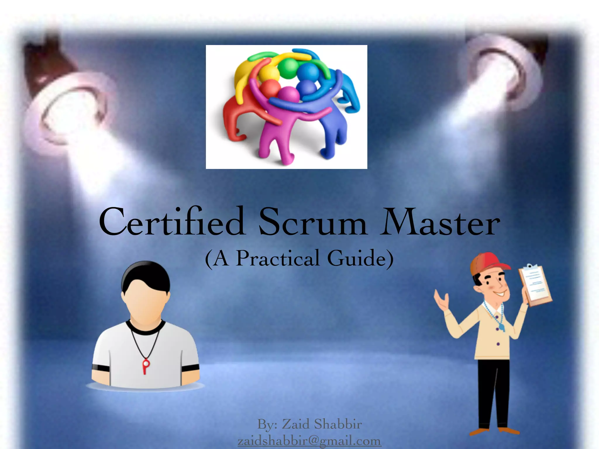 The document serves as a practical guide for Certified Scrum Masters, outlining key concepts such as the roles of Scrum Master, Product Owner, and Development Team, along with Scrum events and artifacts. It emphasizes the importance of Scrum values, roles, responsibilities, and processes aimed at ensuring effective product development and team collaboration. It also includes self-assessment links and resources for those seeking certification.