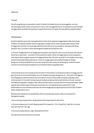 Cerucuk digunakan untuk menguatkan tanah lembut dan membawa beban bangunan ke lapisan tanah yang lebih kukuh. Terdapat beberapa jenis cerucuk seperti konkrit, keluli, kayu, dan mikro yang sesuai digunakan bergantung pada sifat tanah dan beban. Cerucuk direka bentuk untuk menyebarkan beban ke tanah melalui daya geseran atau tanggungan hujungnya.
