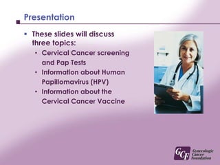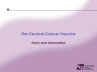 This document provides information about cervical cancer, HPV, and the cervical cancer vaccine. It discusses that cervical cancer is caused by HPV infection, and regular Pap tests are important for screening. HPV is a common sexually transmitted infection that can cause cervical cancer and genital warts. The cervical cancer vaccine protects against the HPV types that cause most cervical cancers and genital warts. It is recommended for girls and women ages 9-26, as effectiveness decreases with increased sexual exposure prior to vaccination. The vaccine is given as a 3-dose series over 6 months, but regular Pap tests are still needed after vaccination.