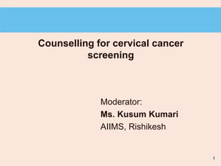 This document discusses counseling for cervical cancer screening. It notes that cervical cancer is the third most common cancer in women worldwide, with over 450,000 new cases and 231,000 deaths each year. Nearly all cervical cancers are caused by infection with human papillomavirus (HPV). Screening methods like Pap smears and visual inspection with acetic acid (VIA) can detect precancerous lesions early to prevent the development of invasive cancer. Integrating cervical cancer screening and treatment with other reproductive health services in community-based settings can help improve access to care.