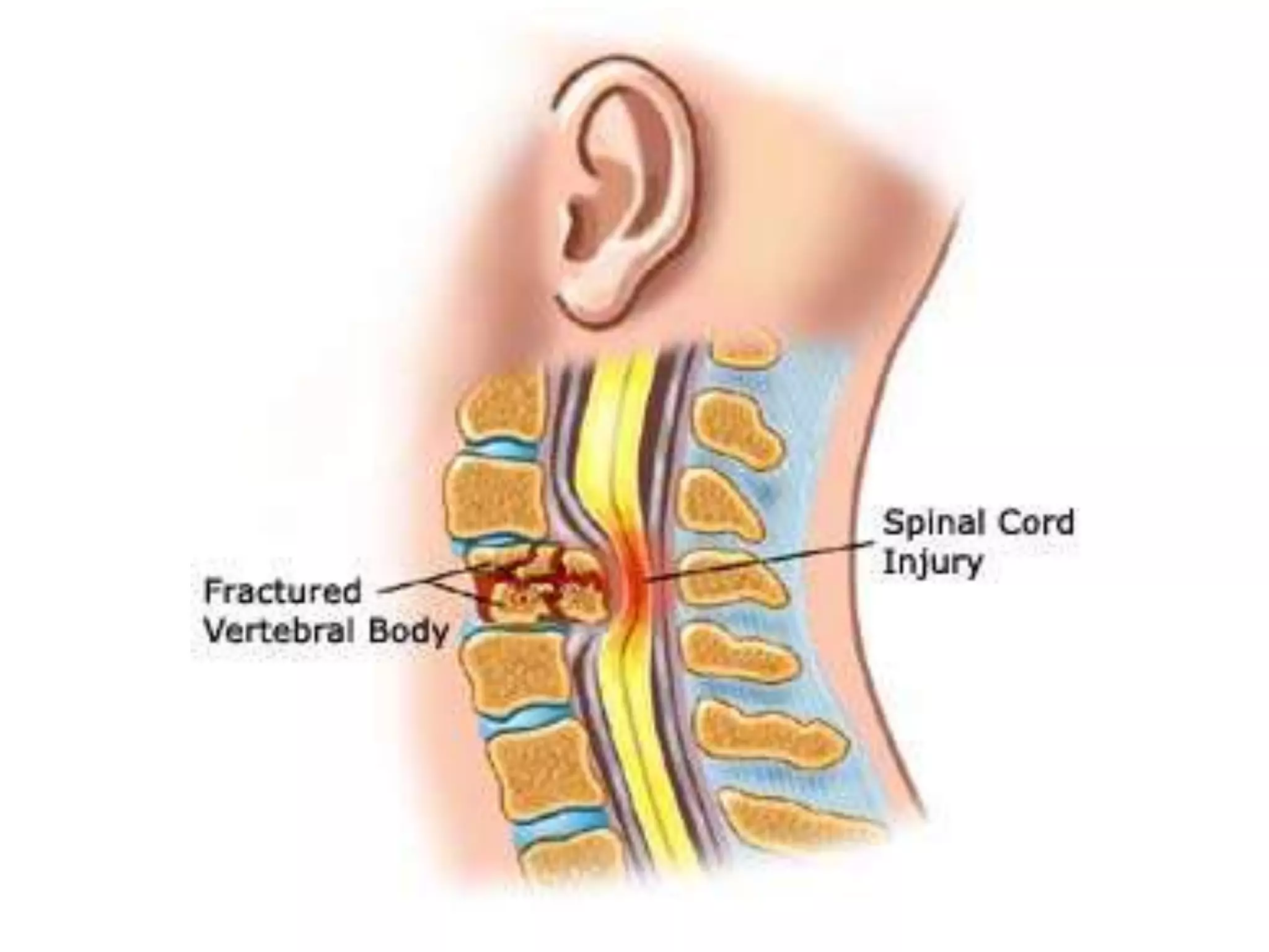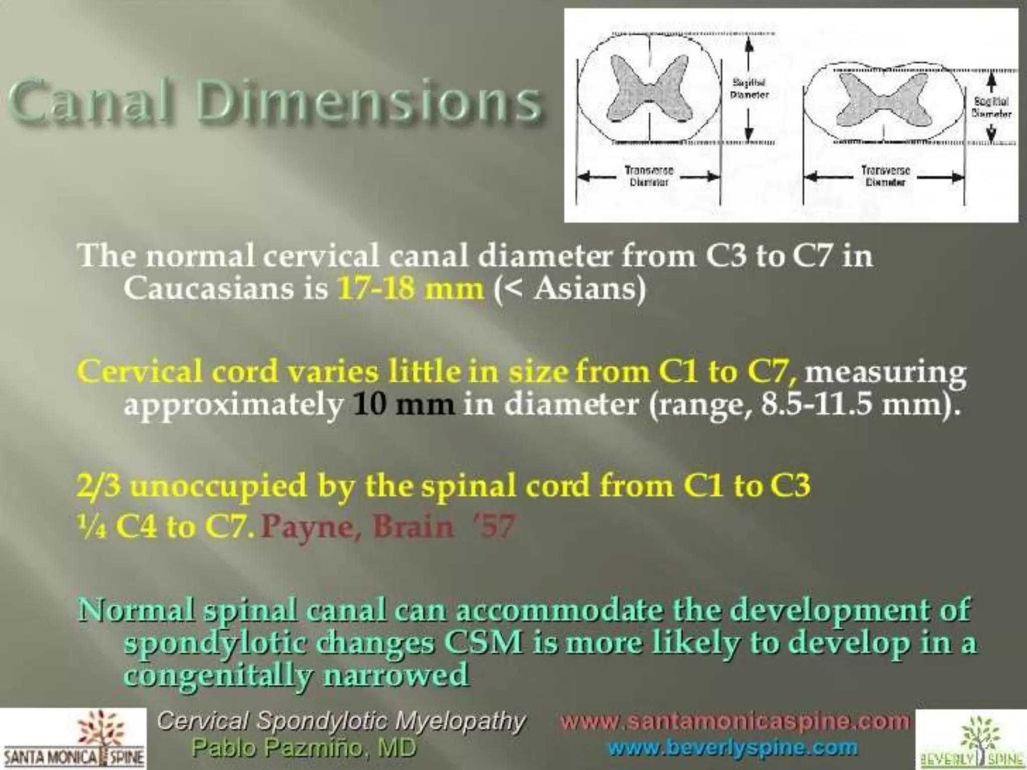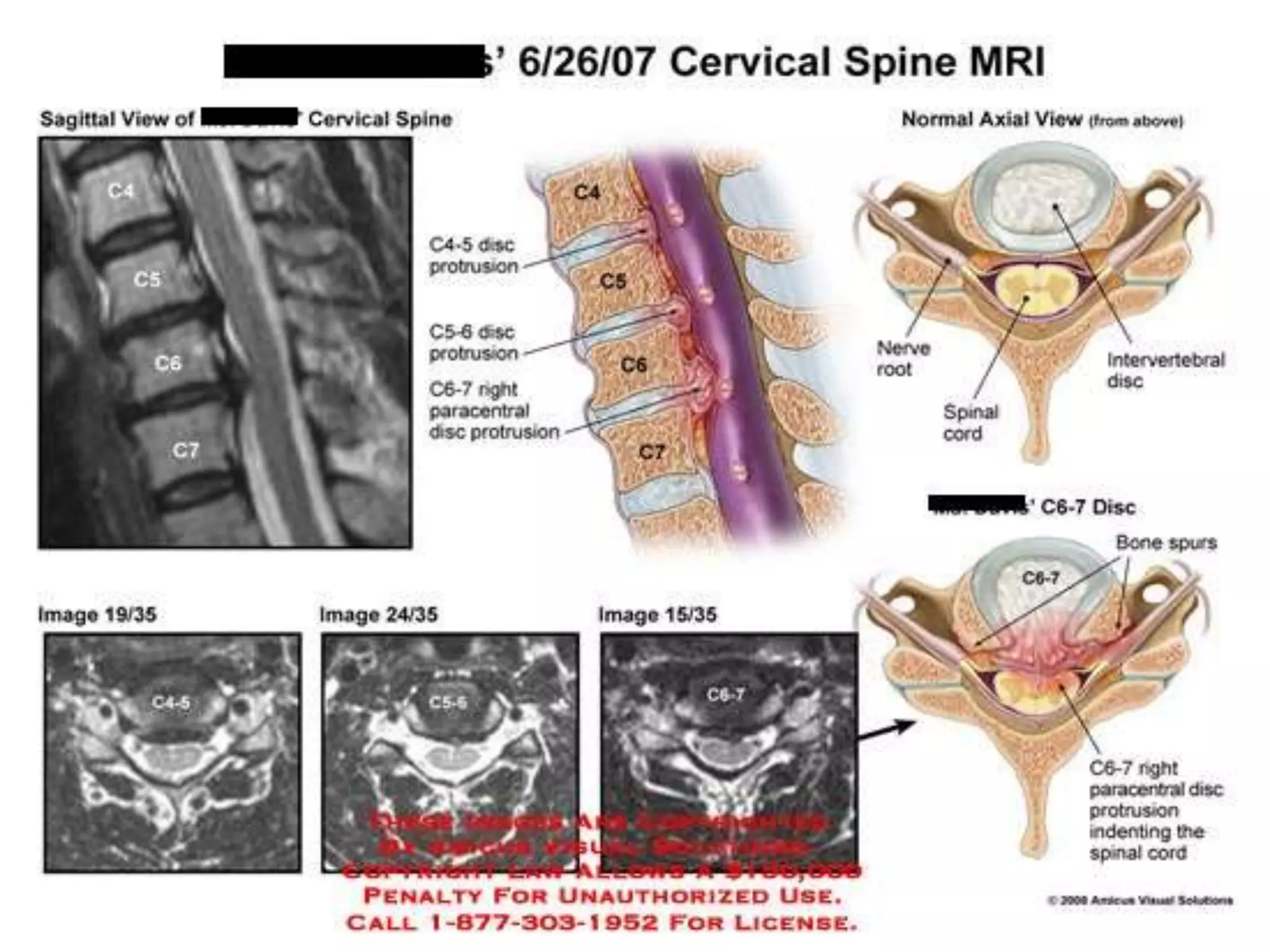 The document discusses cervical spondylotic myelopathy, a spinal cord injury caused by compression of the spinal cord from age-related wear and tear changes in the cervical spine. An MRI of the cervical spine showed a disc protrusion at the C3/C4 level that was causing spinal stenosis, narrowing of the spinal canal and pressing on the spinal cord. The MRI also revealed increased fluid signal within the spinal cord without any abnormality in the cord's natural signal, indicating injury from compression.