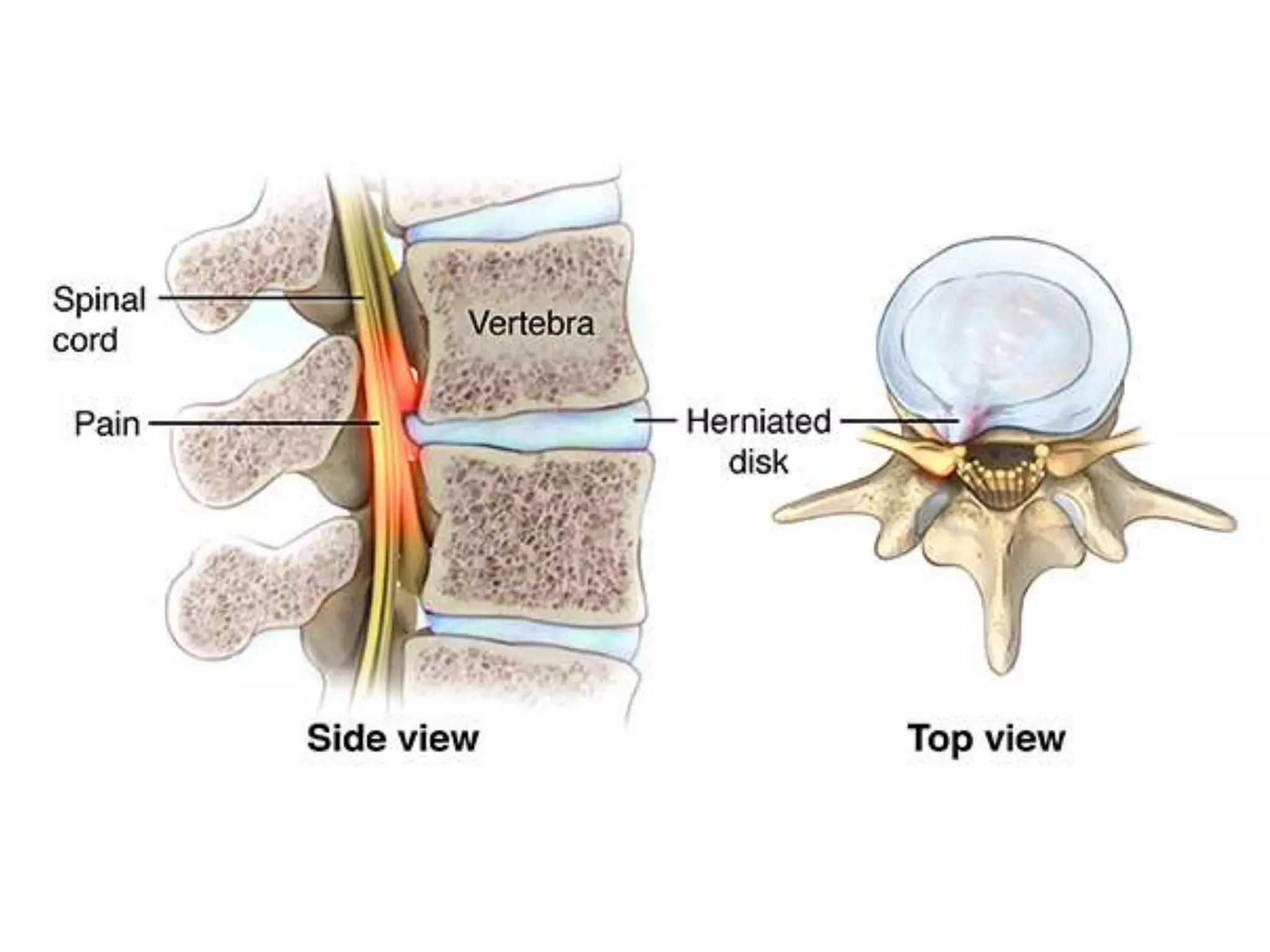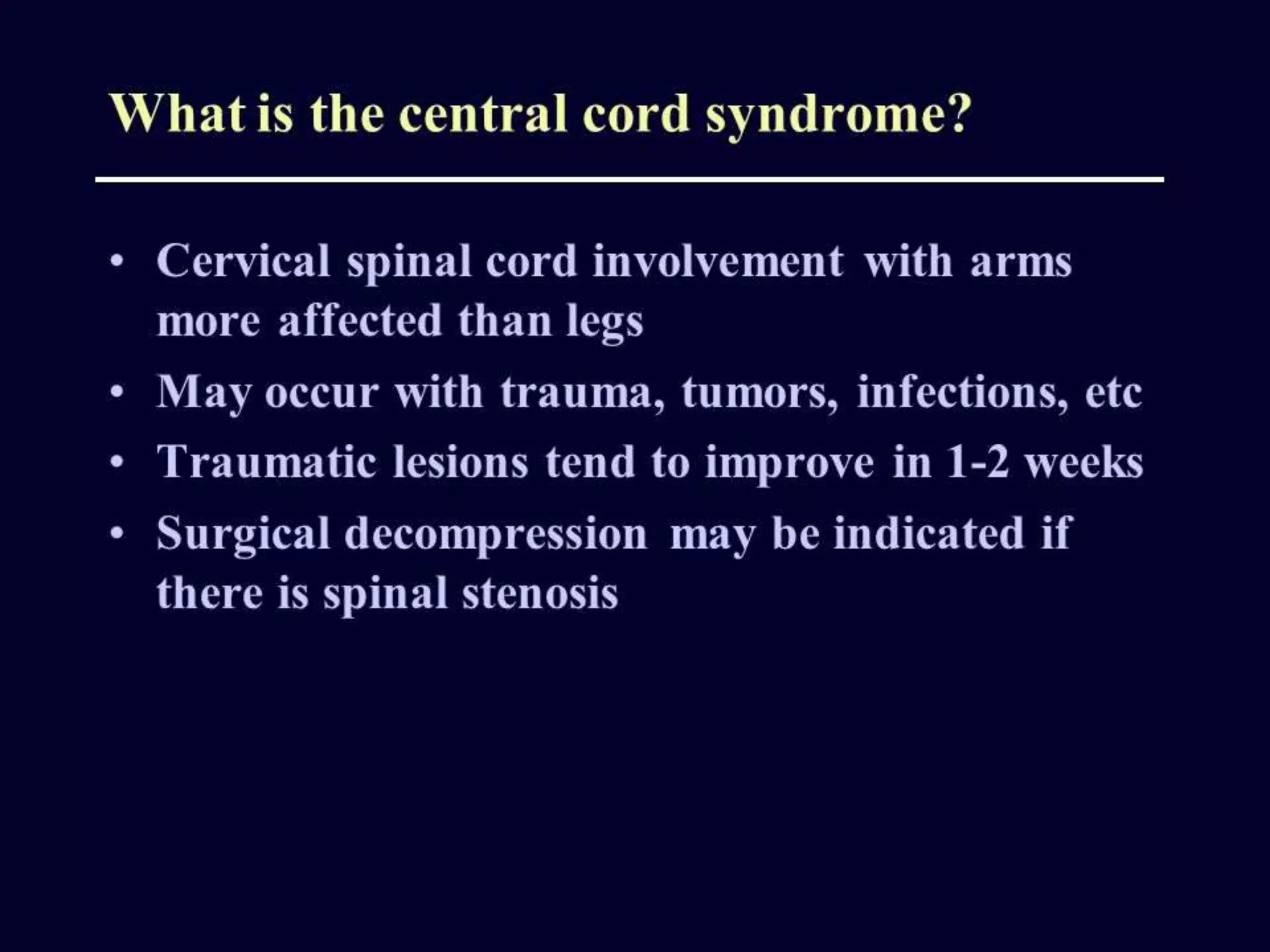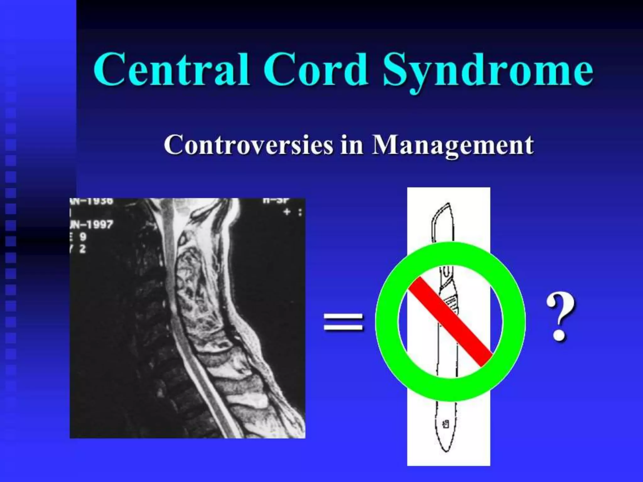 The document discusses cervical spondylotic myelopathy, a spinal cord injury caused by compression of the spinal cord from age-related wear and tear changes in the cervical spine. An MRI of the cervical spine showed a disc protrusion at the C3/C4 level that was causing spinal stenosis, narrowing of the spinal canal and pressing on the spinal cord. The MRI also revealed increased fluid signal within the spinal cord without any abnormality in the cord's natural signal, indicating injury from compression.