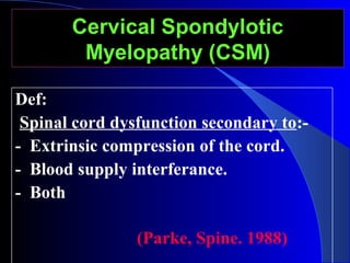 Cervical Myelopathy (CSM) is a common spinal cord dysfunction often seen in individuals over 55, characterized by symptoms such as loss of dexterity, neck stiffness, and leg weakness. Diagnosis involves clinical evaluation and imaging studies, while treatment options range from conservative management to surgical intervention, depending on symptom severity and progression. The document emphasizes the importance of recognizing and treating CSM early to improve patient outcomes and decrease the risk of severe disability.