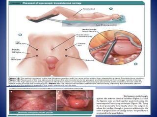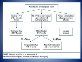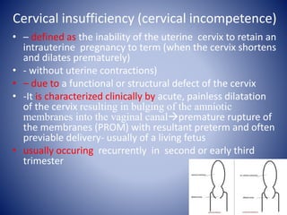 Cervical insufficiency, also known as cervical incompetence, is a condition where the cervix is unable to retain a pregnancy at term due to a functional or structural defect. It is characterized by painless dilatation of the cervix resulting in premature rupture of membranes and delivery, usually occurring in the second or third trimester. Cervical cerclage procedures aim to surgically suture the cervix closed to prevent premature opening. There are several techniques for cervical cerclage placement depending on the location and indication, including McDonald, Shirodkar, emergency/rescue cerclages, and pessary or balloon alternatives. Cerclage procedures can be done through the vagina or abdomen depending
