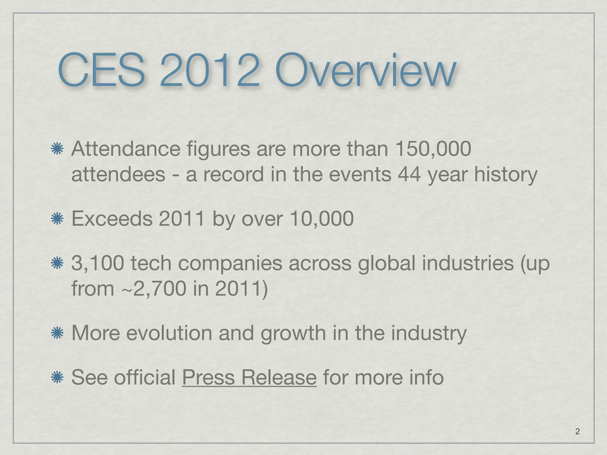 The document summarizes key observations and themes from the 2012 Consumer Electronics Show (CES) conference, including that software is becoming a key differentiator, user experience is important, and tablets are aiming at business users. It also notes Microsoft's reduced presence at the show and increased focus on an integrated experience across its products, as well as growth in areas like ultrabooks, touch displays, smart TVs, phones, health/fitness tech, and opportunities for app developers.