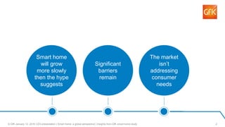 The document summarizes the findings of a GfK study on consumer perspectives on smart homes globally. It finds that while awareness and appeal of smart home technology is high, adoption remains low due to barriers like cost and privacy/security concerns. Additionally, the market lacks interoperability between different vendors' devices. The study suggests the smart home market will grow more slowly than expected until these challenges are addressed by creating easy to use and integrated solutions.