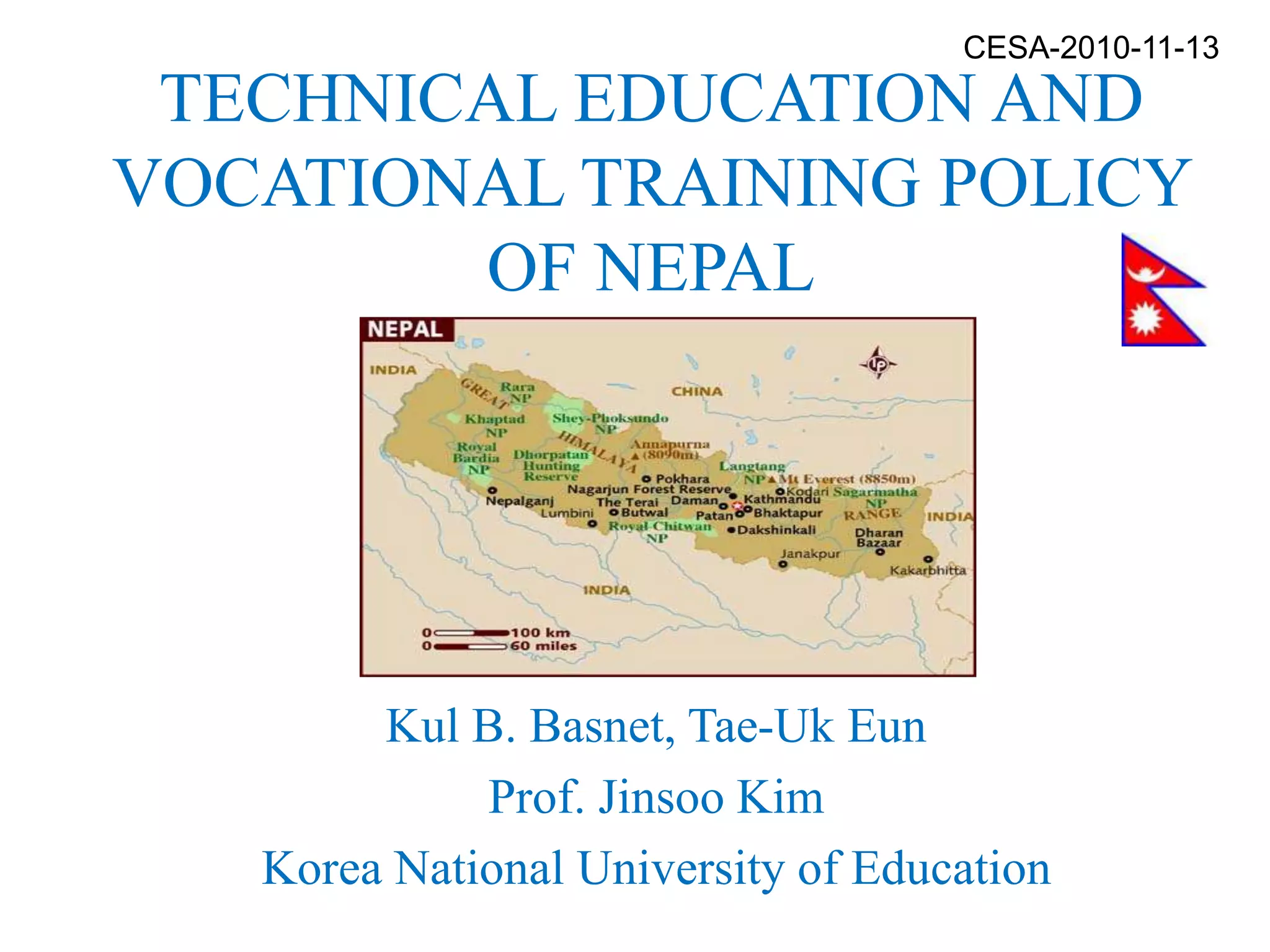 This document describes the current issues and future policy strategies associated with the technical education and vocational training policy of Nepal. It provides an overview of the evolution of technical education and vocational training in Nepal, from the establishment of the first technical school in 1930 to the current Council for Technical Education and Vocational Training (CTEVT) established in 1988 as the apex body. It also outlines the current activities under the TEVT skill development policy of 2007 and key challenges including coordination, access, quality control, and integration of training programs. The conclusion calls for greater participation of stakeholders in policy development and a focus on supporting communities and individuals in self-employment.