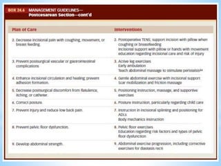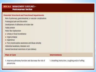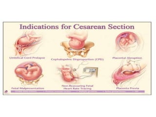 Cesarean section is a surgical procedure to deliver babies through incisions in the mother's abdomen and uterus. The rate of cesarean sections has increased sharply in Egypt in recent years. Physical therapy can help with pain relief, wound healing, reducing adhesions and numbness, and scar management. Techniques discussed include TENS, laser therapy, ultrasound, scar mobilization and more. Abdominal scarring from cesarean sections can impact posture and cause issues like low back pain, so physical therapy is important for recovery.