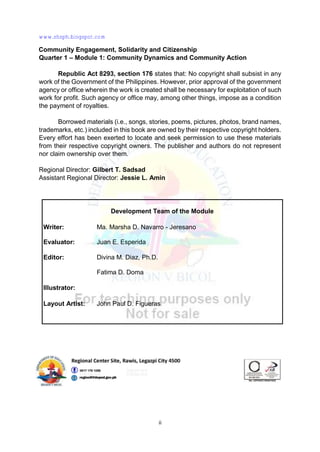 This document discusses community engagement, solidarity, and citizenship. It covers the following key points: