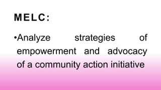 The document discusses empowerment, advocacy, and community engagement. It defines empowerment as an individual's capacity to make choices that can produce desired changes in their lives. Empowerment involves having the ability to make one's own decisions and be listened to. Advocacy involves fighting for the rights of others and having their concerns addressed by targeting people in positions of power. There are three types of advocacy: systems advocacy which focuses on policy change, individual advocacy which focuses on changing an individual's situation, and self-advocacy which focuses on strengthening an individual's ability to communicate their needs. Community engagement, solidarity, and citizenship are important for empowerment and advocacy initiatives.