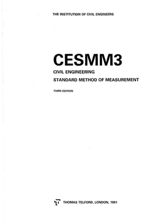 This document summarizes the key changes between editions of the Civil Engineering Standard Method of Measurement (CESMM). The third edition (CESMM3) introduces standard methods of measurement for water main renovation and simple building works incidental to civil engineering projects. It also includes amendments to align with the ICE Conditions of Contract sixth edition. The main changes are minor amendments and corrections with no changes to principles or general arrangement. Feedback from industry organizations was incorporated in drafting CESMM3.