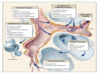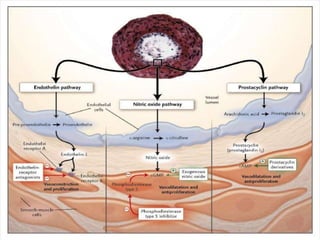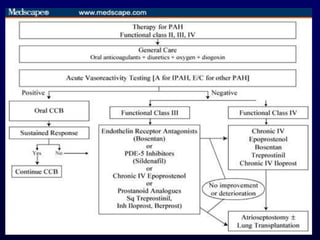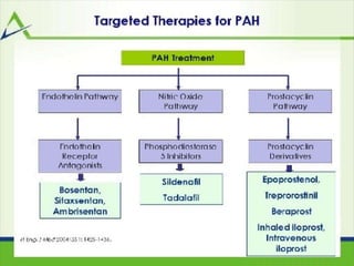 This document provides an overview of pulmonary hypertension (PH), including its definition, classification, pathophysiology, diagnostic workup, and treatment. PH is defined as a mean pulmonary arterial pressure over 25 mmHg at rest. It is classified into 5 groups, with Group 1 being pulmonary arterial hypertension. The pathophysiology involves vasoconstriction, endothelial dysfunction, and vascular remodeling. Diagnosis involves echocardiogram, right heart catheterization, and ruling out other causes. Treatment includes diuretics, anticoagulants, oxygen, and PAH-specific therapies, with the goal of improving functional status and survival.