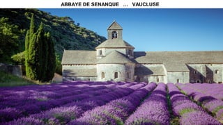 Документ представляет собой перечисление различных живописных мест и туристических достопримечательностей во Франции, включая аббатства, национальные парки и исторические памятники. Упомянутые локации охватывают разнообразные регионы, такие как Воклюз, Корсика, Нормандия и Альпы. Этот список может быть полезен для туристов, планирующих поездки по стране.