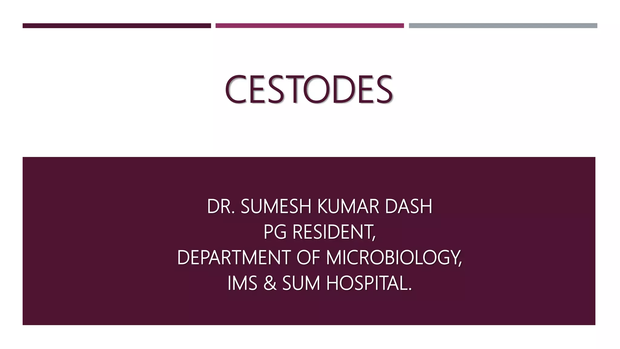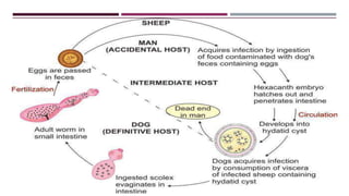 This document summarizes key information about cestodes (tapeworms). It describes the morphology, lifecycles and transmission of Taenia saginata, Taenia solium, and Echinococcus granulosus. T. saginata causes intestinal taeniasis in humans through ingestion of undercooked beef containing the larval stage. T. solium can cause intestinal taeniasis or cysticercosis depending if the person is a definitive or intermediate host. E. granulosus causes cystic hydatid disease in humans through ingestion of food contaminated by dog feces containing eggs.