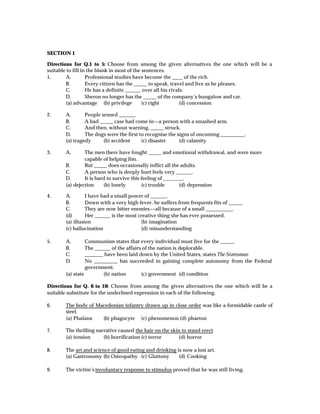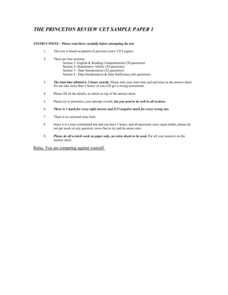 This document provides instructions for a sample test that consists of 4 sections testing English, quantitative ability, data interpretation, and data sufficiency. It notes that the test is 2 hours, there is a positive mark for correct answers and negative mark for incorrect answers, and advises test takers to move quickly between questions. It also provides examples of question types and content that will be on the test.