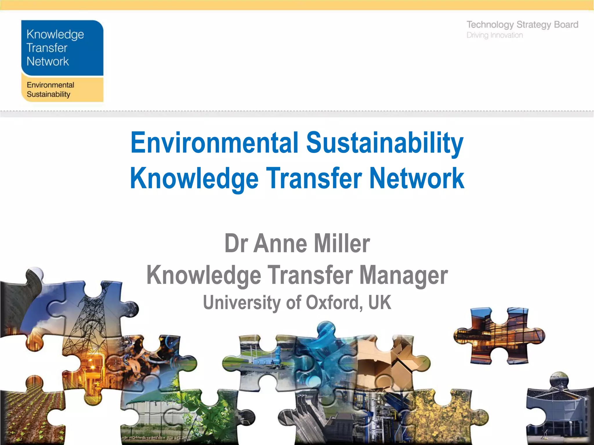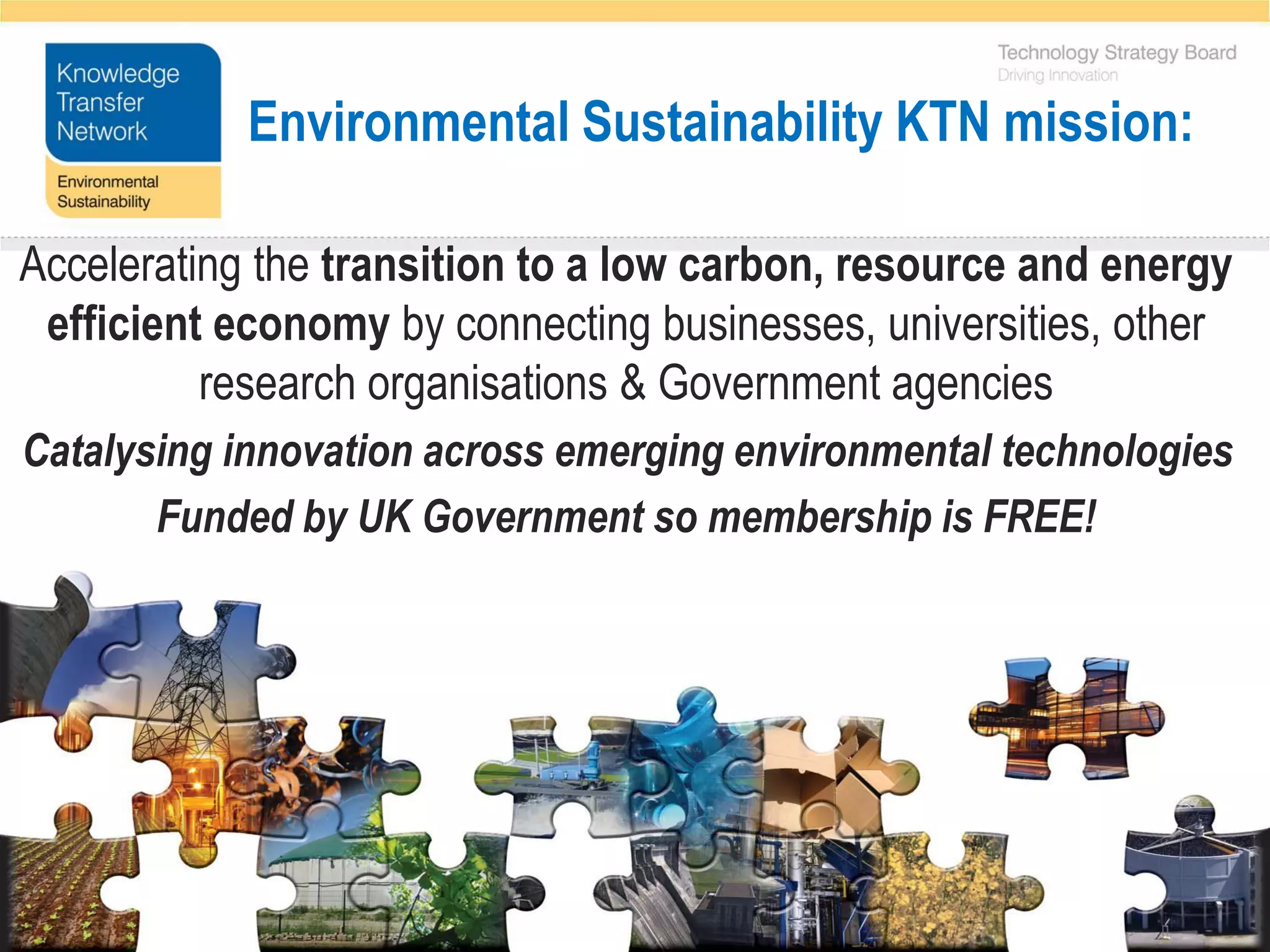 The Environmental Sustainability Knowledge Transfer Network (ESKTN) aims to accelerate the transition to a low carbon economy by connecting businesses, universities, and government agencies. It focuses on emerging environmental technologies and is funded by the UK government, so membership is free. Key priority areas include sustainable land management, food production, ecosystem services, biodiversity, and natural capital. The ESKTN works with initiatives like the UK National Ecosystem Assessment, which evaluates the economic value of ecosystem services, and the Natural Capital Initiative to engage businesses in sustainability. An upcoming workshop will bring together business and academic partners to develop collaboration opportunities.