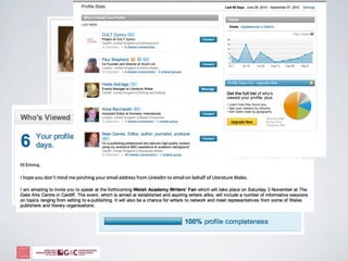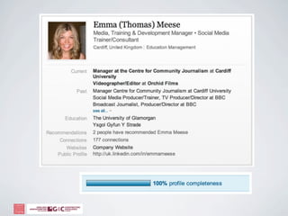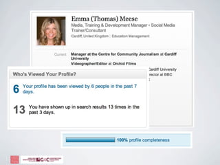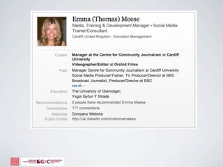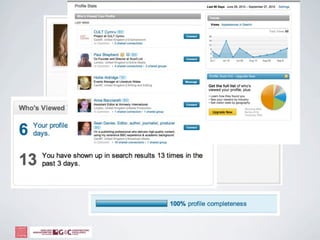 The document discusses how social media can help businesses by allowing them to listen to customer conversations, spot new ideas, extend their network, and engage with customers. It provides tips for using social media platforms like Twitter effectively through search, etiquette, and profile customization. The document also recommends ways to fill networks with valuable connections through browsing existing connections, advanced searches, and joining relevant groups.