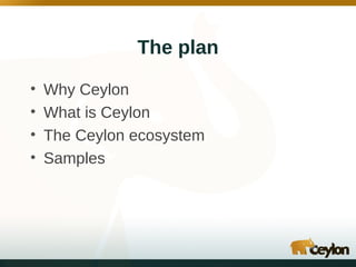 This document introduces Ceylon, describing it as powerful, readable, and predictable. It discusses key features of Ceylon like static typing, functional aspects, reified generics, and modularity. The document also outlines the Ceylon ecosystem, including its minimal core module, IDE support, command line interface, SDK modules, module repository, and web framework. Samples are provided to demonstrate Ceylon.