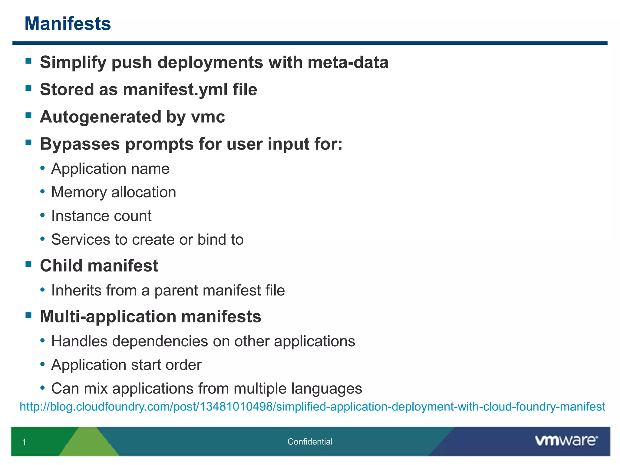 Manifest files allow developers to simplify deploying applications to Cloud Foundry by storing deployment metadata, like the application name, memory allocation, and services to bind, in a manifest.yml file. This bypasses prompts for user input. Manifests can inherit properties from a parent file, and multi-application manifests can define dependencies between applications, set start order, and deploy apps in multiple languages together.