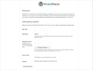 git@github.com:dmikusa-pivotal/cf-ex-worpress.git $ cd cf-ex-worpress/ $ cf push --buildpack=https://github.com/dmikusa-pivotal/cf-phpapache-buildpack.git