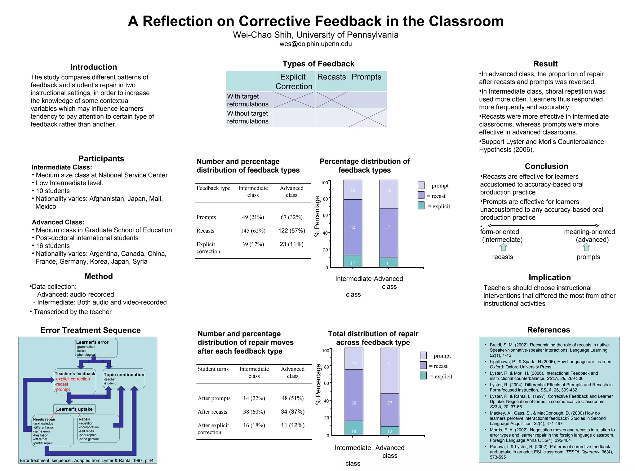 The document summarizes a study that compares different patterns of corrective feedback and student repair in two language classes - an intermediate and advanced class. The study found that recasts were more effective for eliciting repairs in the intermediate class, while prompts worked better in the advanced class, supporting the Counterbalance Hypothesis. The type of feedback used differed between the classes, with the intermediate class relying more on choral repetition and the advanced class using more prompts.