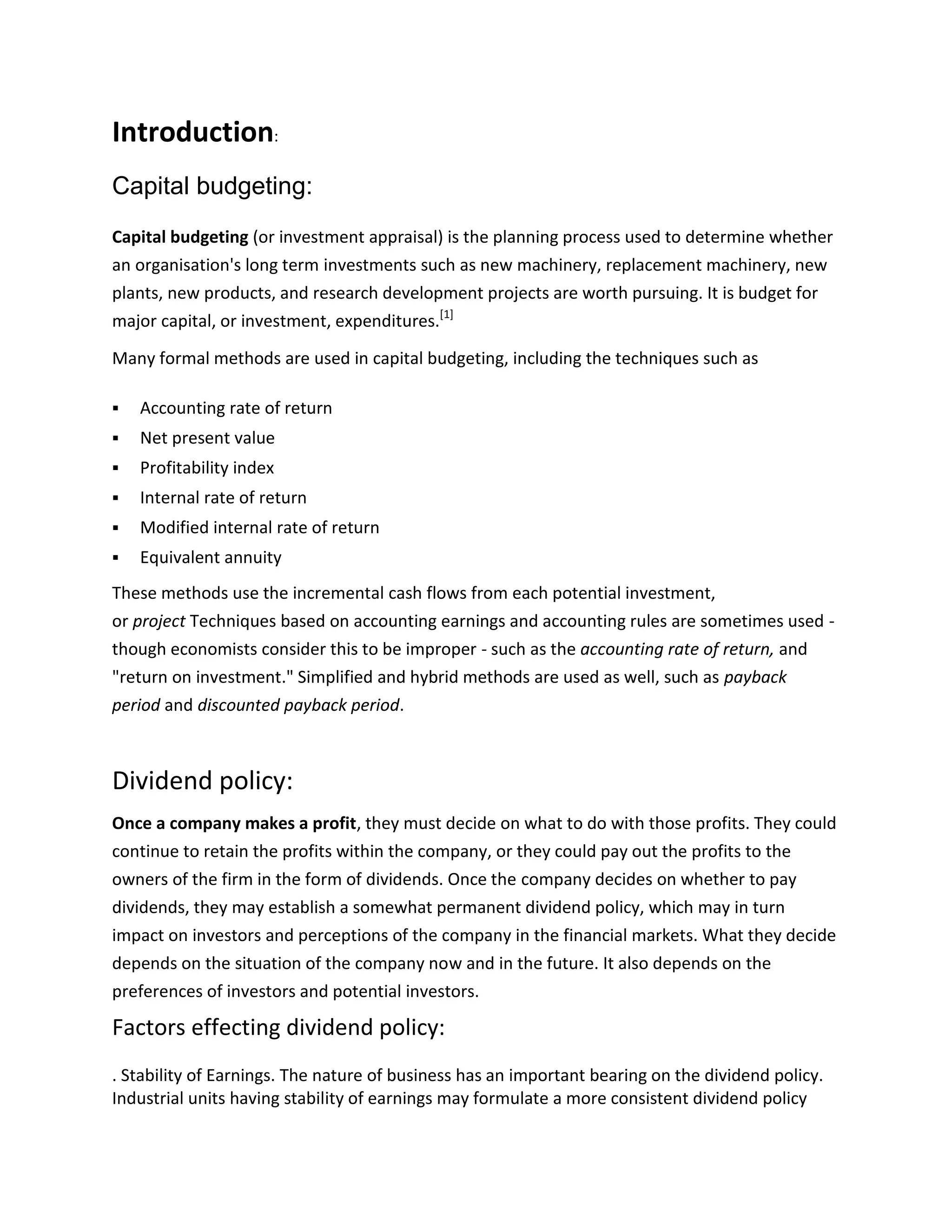 Capital budgeting is the process used by organizations to determine whether long-term investments are worth pursuing. It involves evaluating investments using formal methods like net present value, internal rate of return, and payback period. Dividend policy refers to a company's decision to retain or distribute profits to shareholders as dividends. Factors that influence dividend policy include stability of earnings, liquidity, needs for additional capital, government policies, taxation, and past dividend rates. Tech Mahindra is an Indian IT services company that provides consulting and services to telecommunications companies globally.