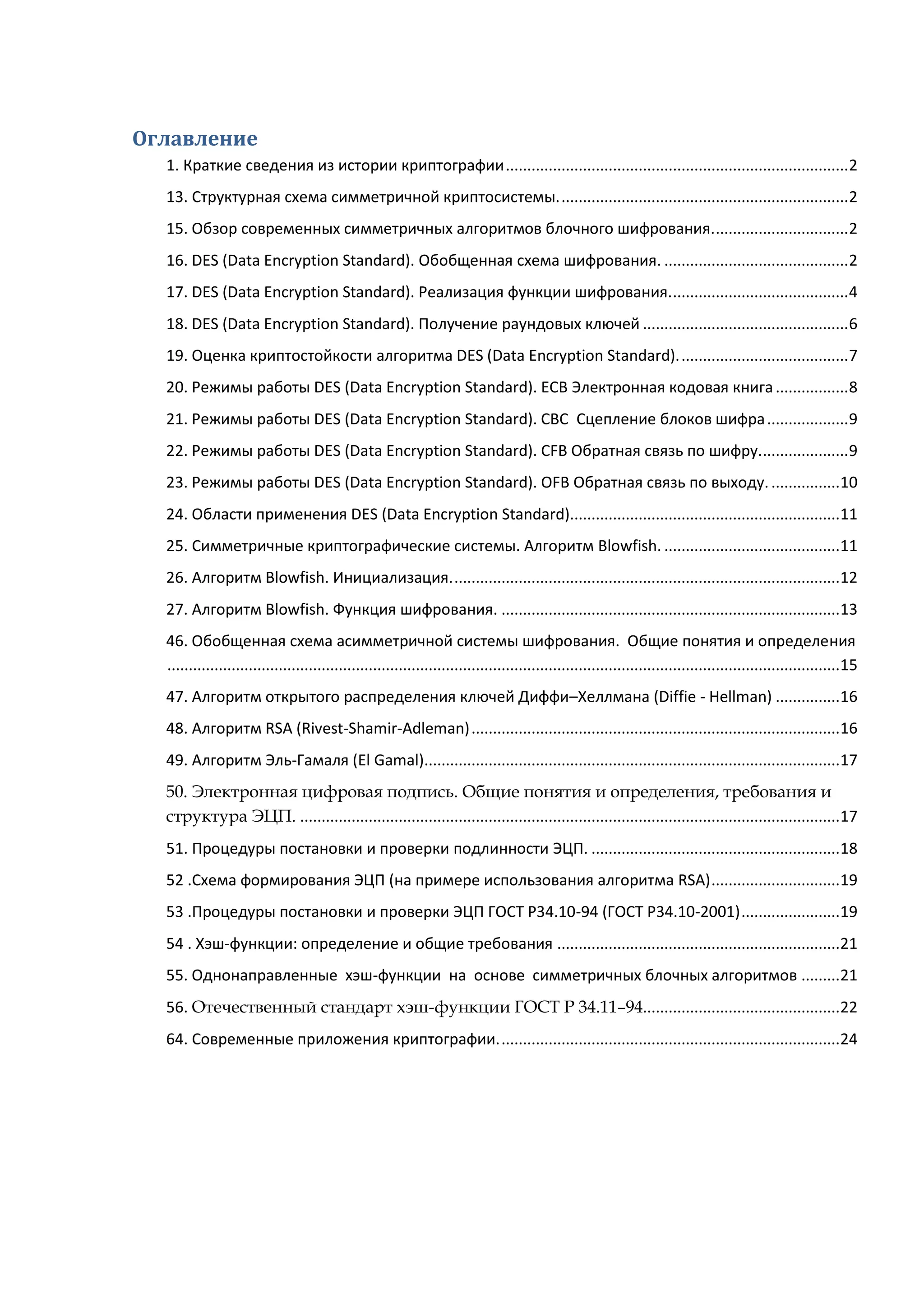 Документ посвящен криптографии, включая историю, симметричные и асимметричные криптосистемы, алгоритмы шифрования, такие как DES и Blowfish, и их применение. Подробно анализируются различные режимы работы шифров, их криптостойкость и основные принципы, включая получение ключей и хэш-функции. Документ также охватывает современные приложения криптографии и требования к безопасности.