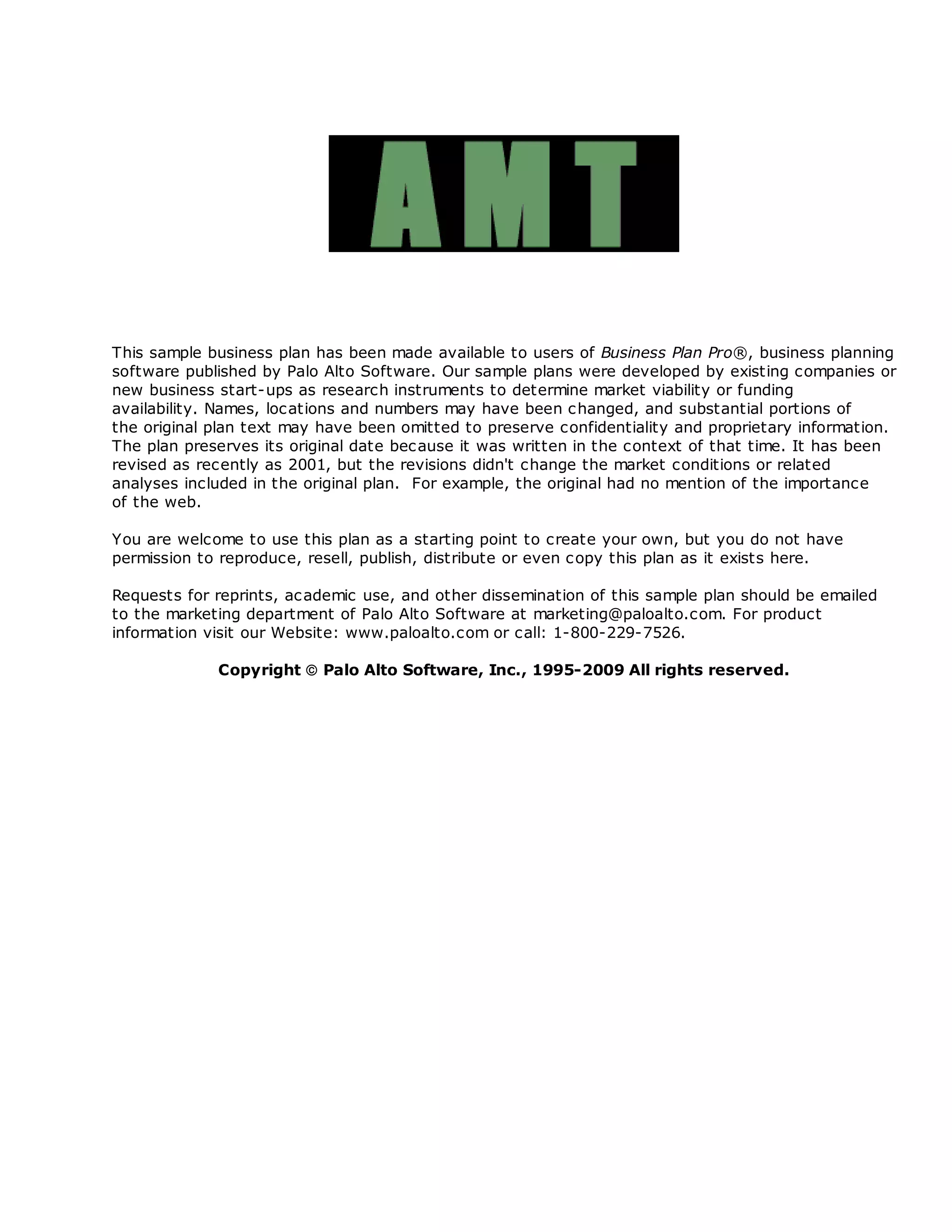This business plan aims to help AMT, a computer reseller, increase its sales and profitability over the next three years. It outlines objectives such as achieving $9 million in annual sales and increasing the gross margin to over 30%. The plan emphasizes differentiating AMT from competitors by offering superior service and support. It analyzes AMT's past performance, which shows declining gross margins. The plan also provides sales forecasts and discusses strategies for improving marketing, management, and financial performance. The overall goal is for AMT to establish itself as a trusted technology partner for small businesses through high-quality service.