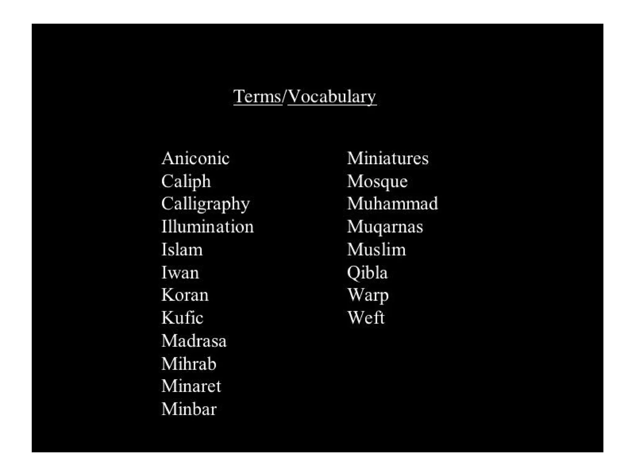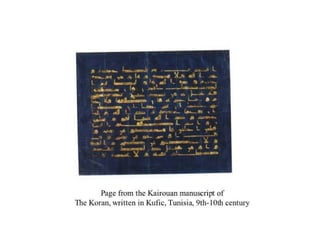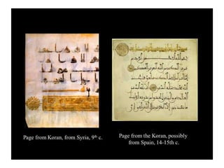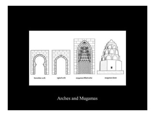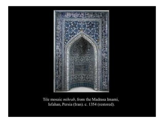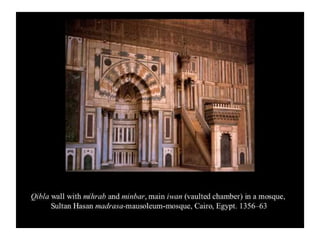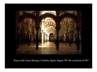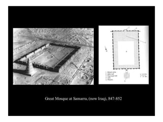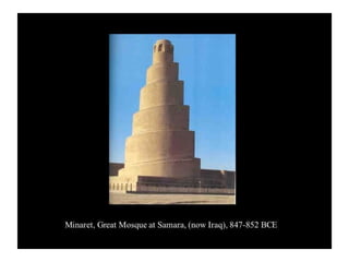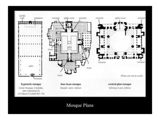 - The passage outlines some key aspects of early Islamic architecture, including the use of geometry and calligraphy in mosques, as well as common architectural elements like minarets, mihrabs, and hypostyle halls supported by columns.