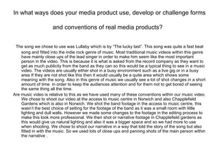 The document summarizes a student's evaluation of their music video project. It describes the genre of music used and how the video incorporates conventions of that genre, such as close-ups of the lead singer. It discusses the locations used to film the band and narrative elements. The student reflects on feedback which suggested improving the band footage and planning more. The evaluation also outlines the media technologies used in production and presentation of the project.