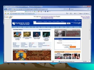 Myspace is a social networking website founded in 2003 that grew to be very popular, reaching over 110 million active users by 2008. It allowed users to share content like photos, videos, and music. Myspace earned revenue primarily through advertisements targeted based on user data and profiles. Though it lost users to competitors like Facebook after 2008, Myspace still had many engaging features that attracted users to share and connect with friends online.