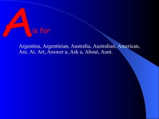 This document is an alphabet book that provides words beginning with each letter of the alphabet. For each letter, multiple words are listed that start with that letter, including names of countries, family members, activities, and other common nouns. The book touches on vocabulary from A to Z in a simple, alphabetical format intended for language learning.