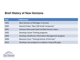 New Horizons provides training and certifications to help people get jobs. It has many locations across Michigan where it offers traditional and flexible classes to help address the state's high 14.1% unemployment rate. Studies show organizations with certified IT staff have fewer issues and lower costs. New Horizons offers programs in various areas including IT, business, healthcare and project management to improve people's skills.