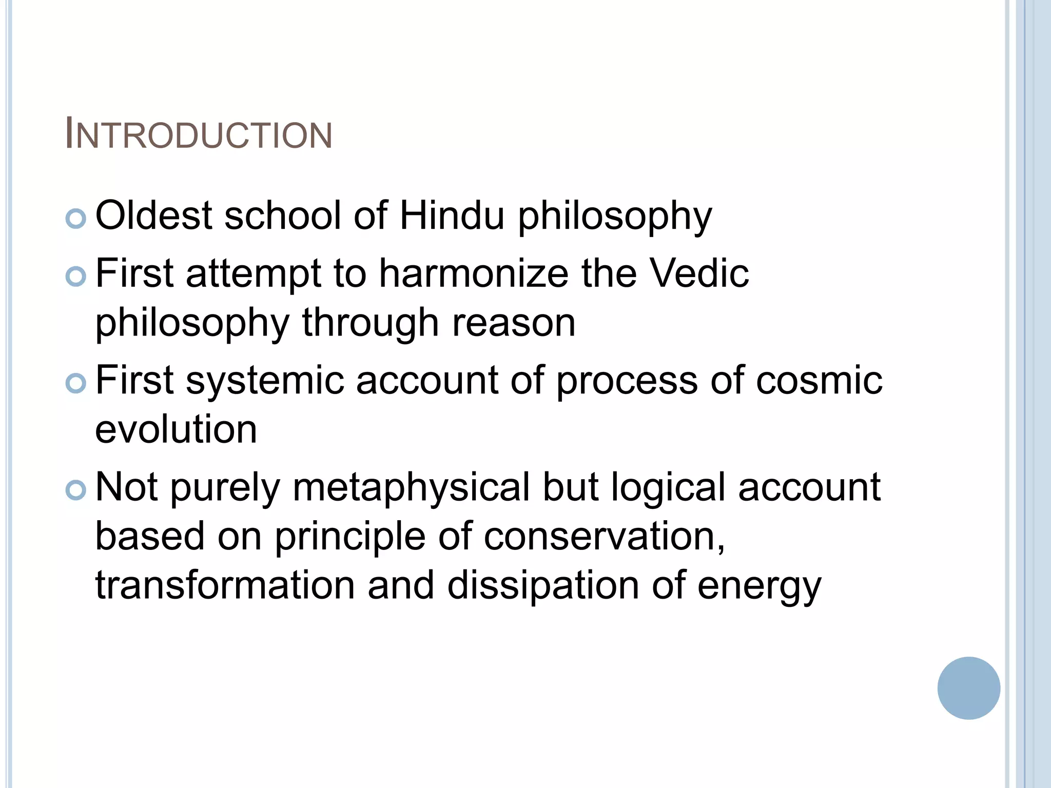 The Sankhya philosophy is one of the oldest schools of Hindu philosophy that sought to explain the process of cosmic evolution through rational analysis and principles of energy transformation. It was founded by Kapila around 1000 BC and enumerates twenty-five principles or categories by which the universe evolves from a primordial state through stages of increasing complexity. Key aspects of Sankhya include the distinction between purusha (consciousness) and prakriti (matter), the three gunas (qualities) that characterize prakriti, and the evolution of the cosmos from subtle elements to grosser ones and its eventual dissolution back to an unmanifest state.