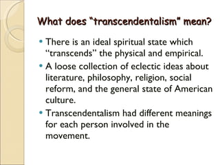 Transcendentalism was a philosophical and literary movement that originated in the 1830s and 1840s in New England. It was centered around Ralph Waldo Emerson and stressed intuition, inspiration, individualism, and nature. Some of the core beliefs of Transcendentalists included that an individual is the spiritual center of the universe; all knowledge begins with self-knowledge; and nature is symbolic and full of signs.
