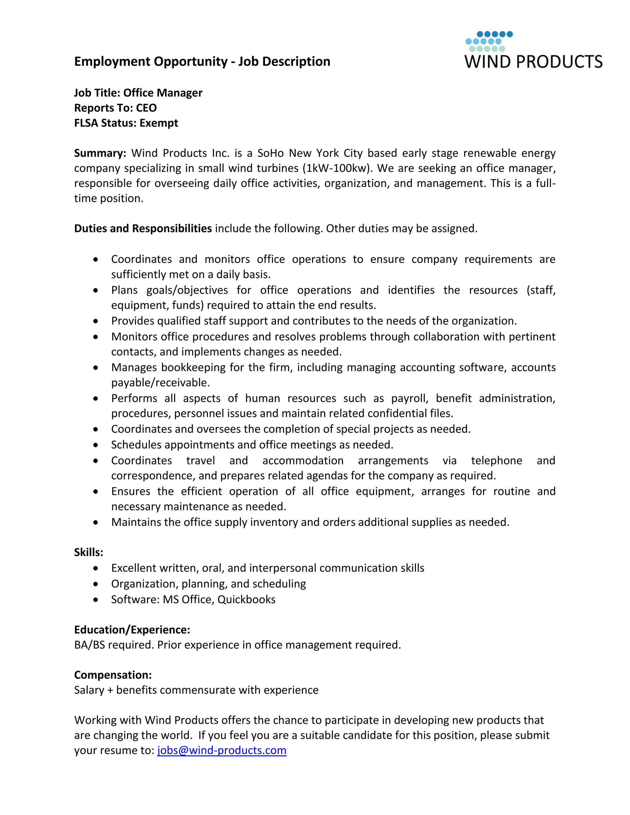 Wind Products Inc. is seeking an office manager to oversee daily operations and management. Responsibilities include coordinating office activities, planning goals and identifying resources, managing bookkeeping and accounting software, handling human resources tasks like payroll and benefits, and ensuring efficient operation of office equipment. The ideal candidate has excellent communication skills, is well-organized, and has a BA/BS degree and prior experience in office management.