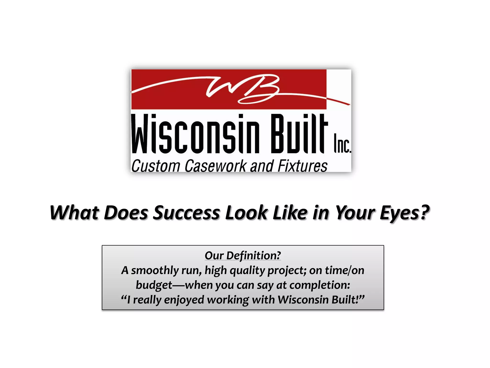 Wisconsin Built is a manufacturing company founded in 1988 in Deerfield, Wisconsin by Jeff Ball. It started with an 8,000 square foot facility and has since expanded to 220,000 square feet across two facilities. Wisconsin Built considers a project successful when it is completed on time, on budget, and with satisfied customers who enjoyed working with the company. The company has over 28 years of experience working with wood, veneers, solid surfaces, custom metal fabrication, glass, and upholstery. It is committed to energy conservation efforts such as acquiring renewable energy credits and recycling waste.