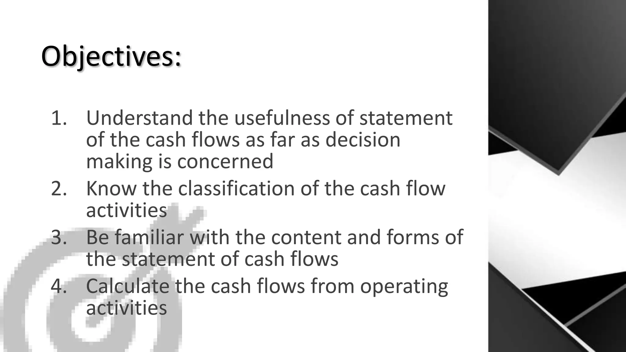 The document discusses cash flow analysis and the statement of cash flows. It describes the statement of cash flows as a financial report that records a company's cash inflows and outflows. It explains that the statement of cash flows has three sections - operating, investing, and financing activities - which classify transactions and events. The direct and indirect methods for preparing the statement of cash flows are also outlined.