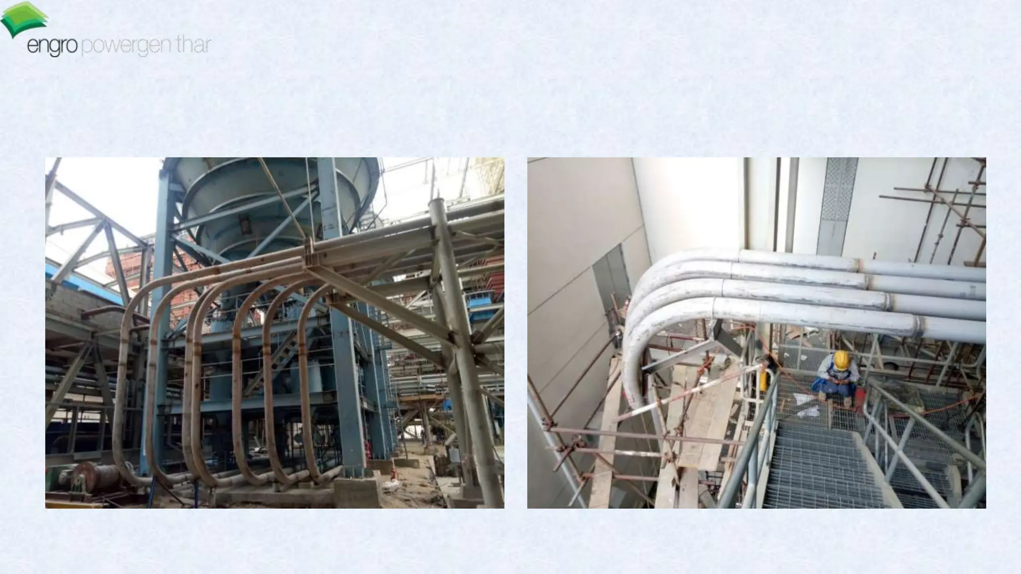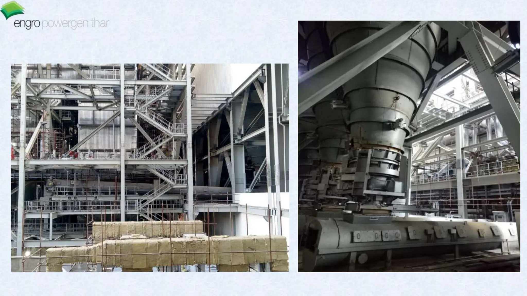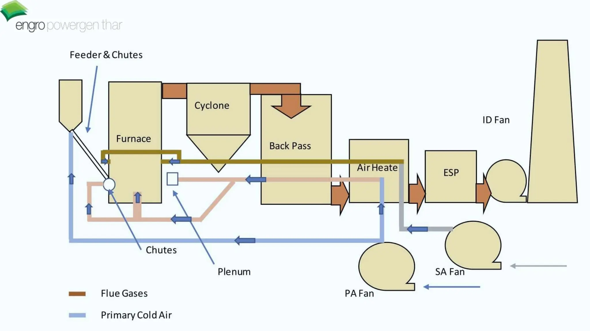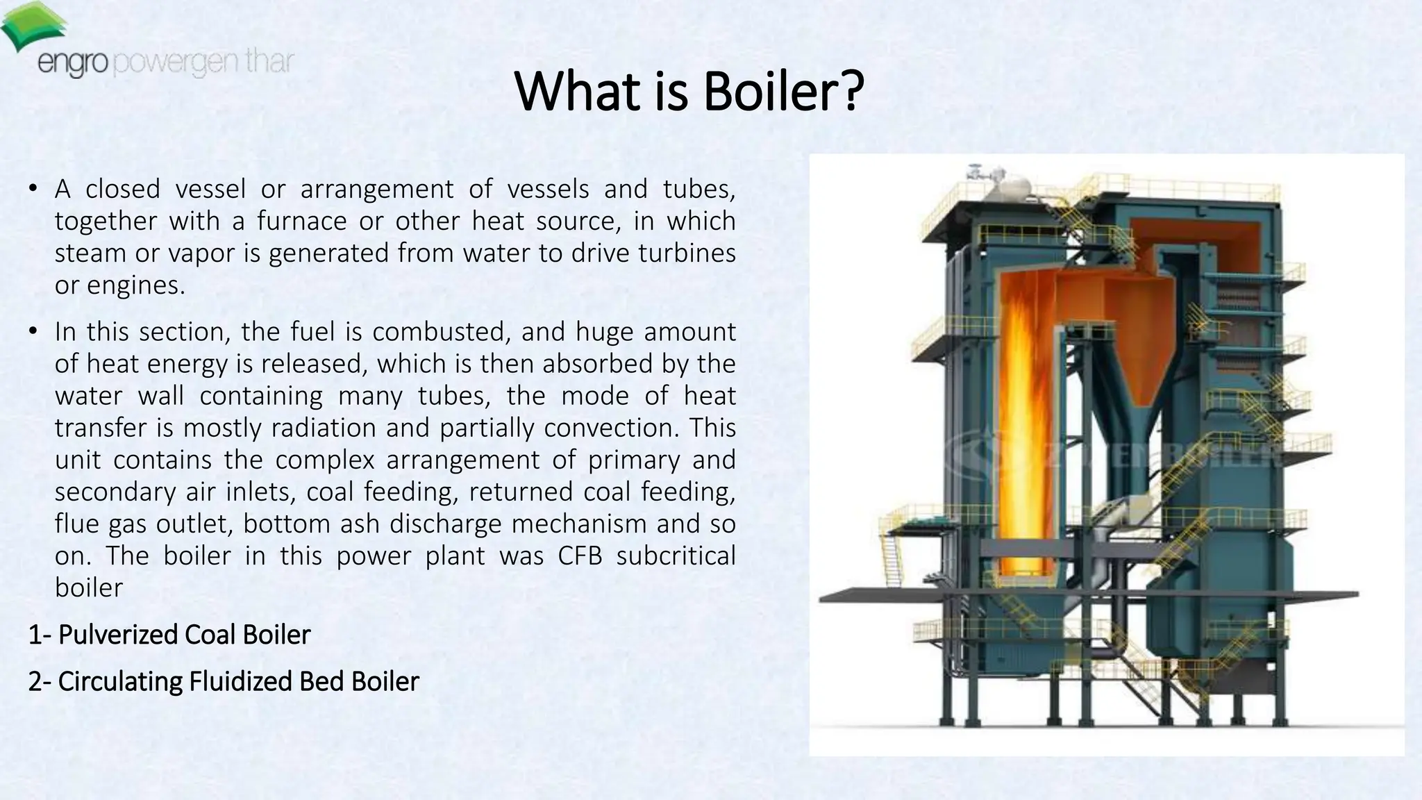 The document describes the key components and operation of a circulating fluidized bed (CFB) boiler. The CFB boiler combusts crushed coal between 20-50mm in size using fluidized air. Unburnt coal is returned to the furnace through a cyclone separator. The main components are the furnace, cyclone separator, back pass, and air preheater. In the furnace, coal is combusted and limestone is added to reduce SOx emissions. The cyclone separator separates unburnt particles from flue gas. Heat from flue gas is transferred in the back pass to produce steam. The air preheater improves efficiency by preheating combustion air.