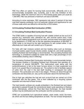 The document provides an overview of Circulating Fluidized Bed Combustion (CFBC) technology. It discusses how CFBC works, including operating at lower temperatures than pulverized coal combustion to reduce emissions while effectively burning a variety of fuels. CFBC has advantages like fuel flexibility, high combustion efficiency, in-situ pollution control, and operational flexibility. Over 310 CFBC boilers are in operation worldwide. Major technology suppliers include Foster Wheeler, Lurgi, Babcock & Wilcox, and the technology is commercially proven.