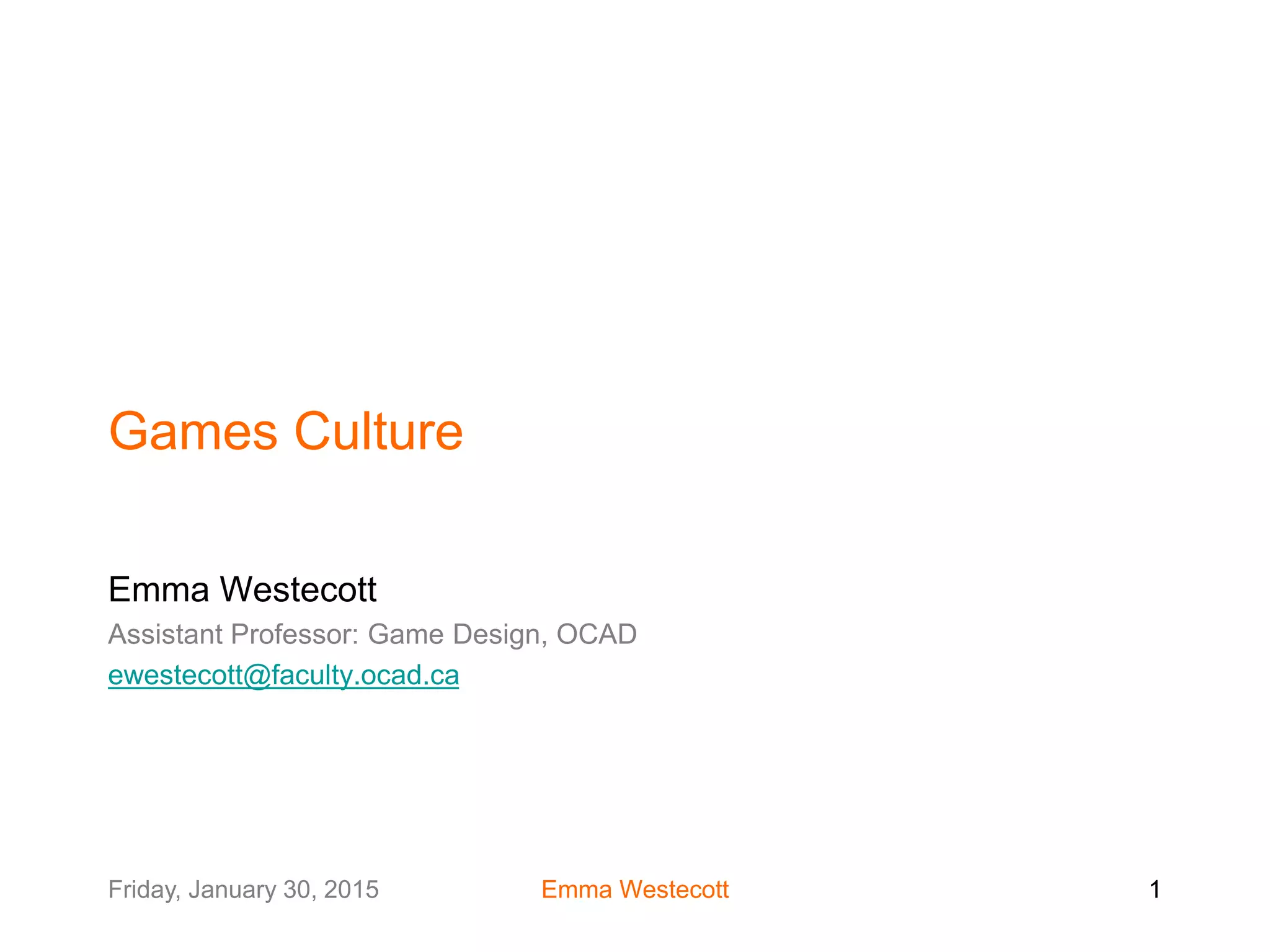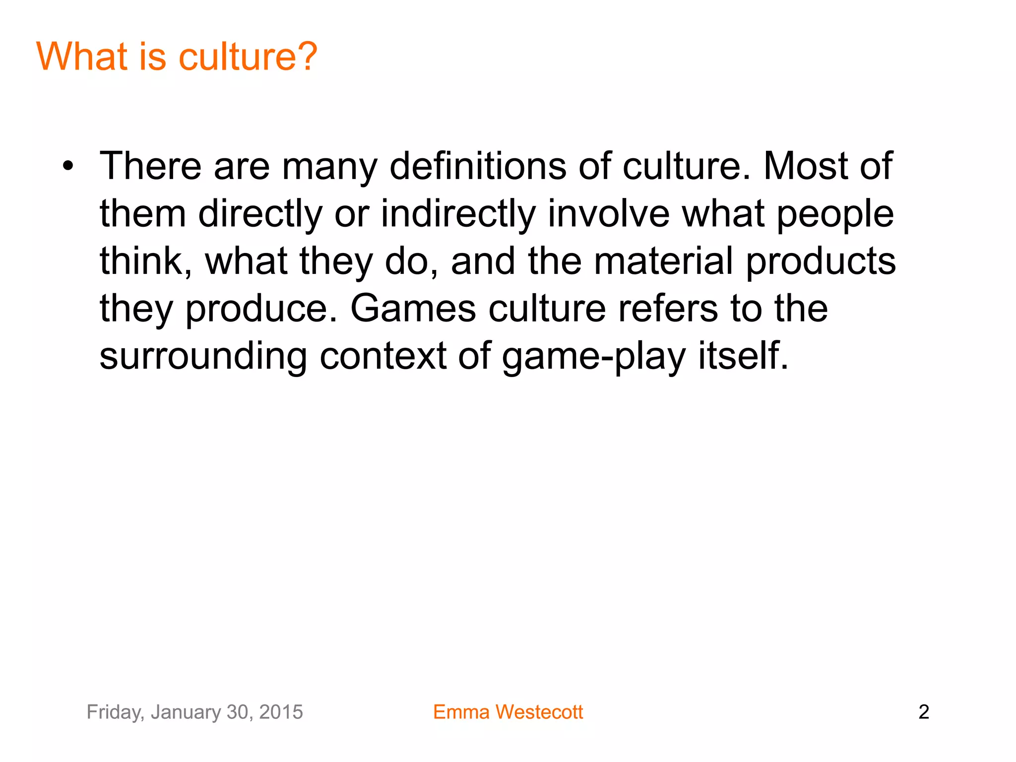 This document discusses games culture and the concept of games as cultural representations. It addresses how games both reflect and can transform culture. Games are considered as cultural texts that can be interpreted. The concept of play culture is introduced, where play enhances social life and early culture had play-like qualities. Different views on games and media are presented, including how games can be seen as art forms through modding, machinima, and independent game development. The concept of the player character is discussed as the representation of player agency in games.