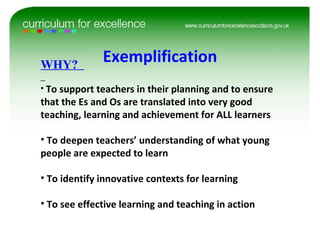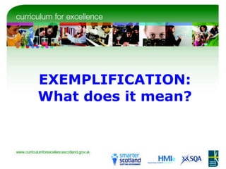 The document discusses exemplification, which is providing examples of student work to support teachers' understanding of learning standards and effective teaching practices. It provides examples of exemplification in modern languages and materials science. Exemplification materials could include case studies, student work, audio/video clips, and interactive online resources. Quality assurance and partnership with organizations will be important to develop high-quality exemplification. The document also prompts reflection on how exemplification might be implemented and supported through digital tools like GLOW.