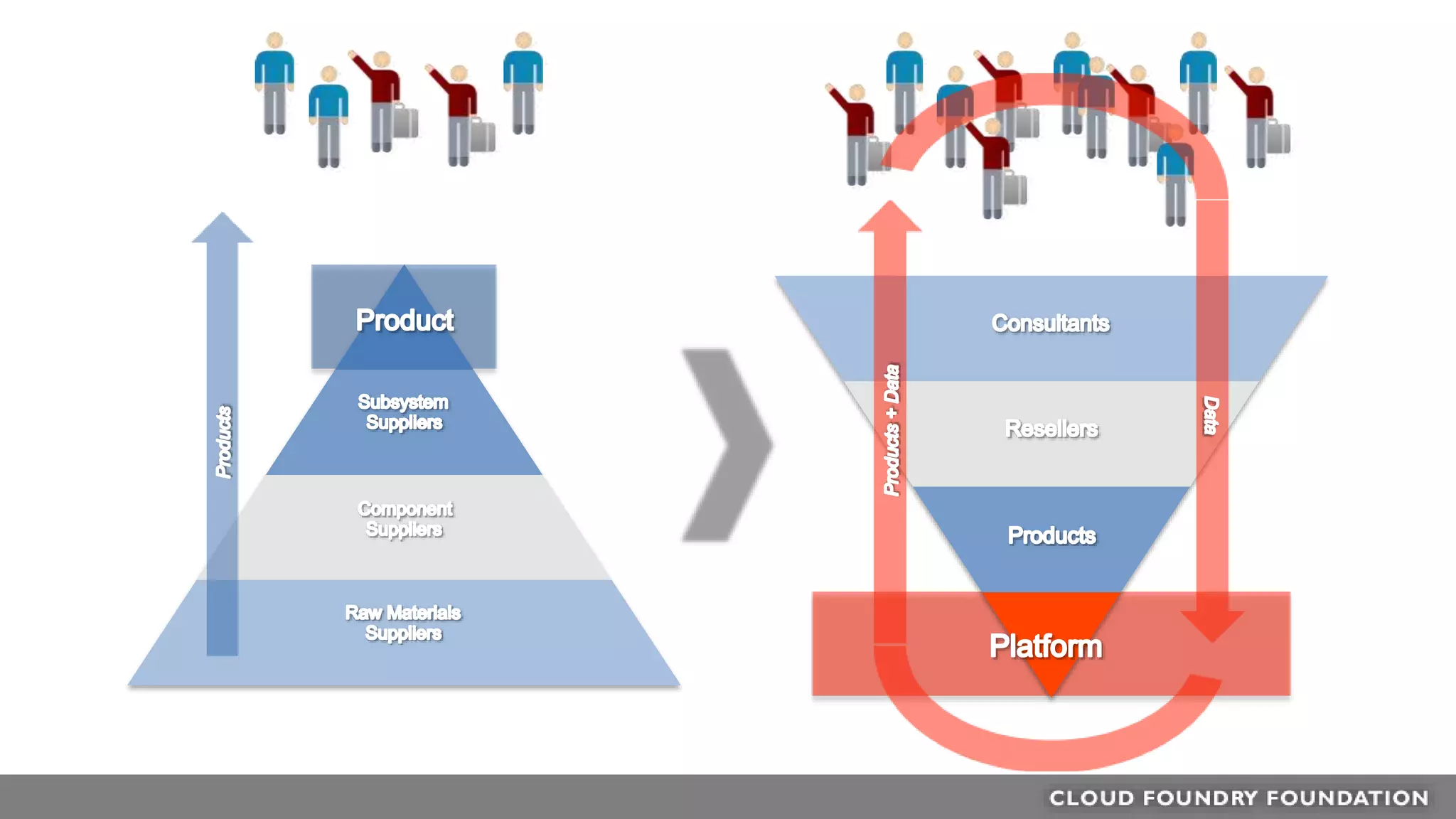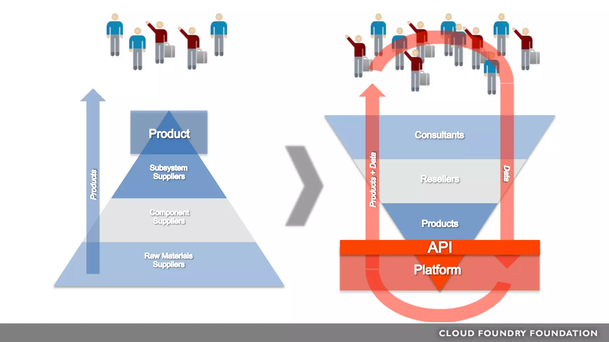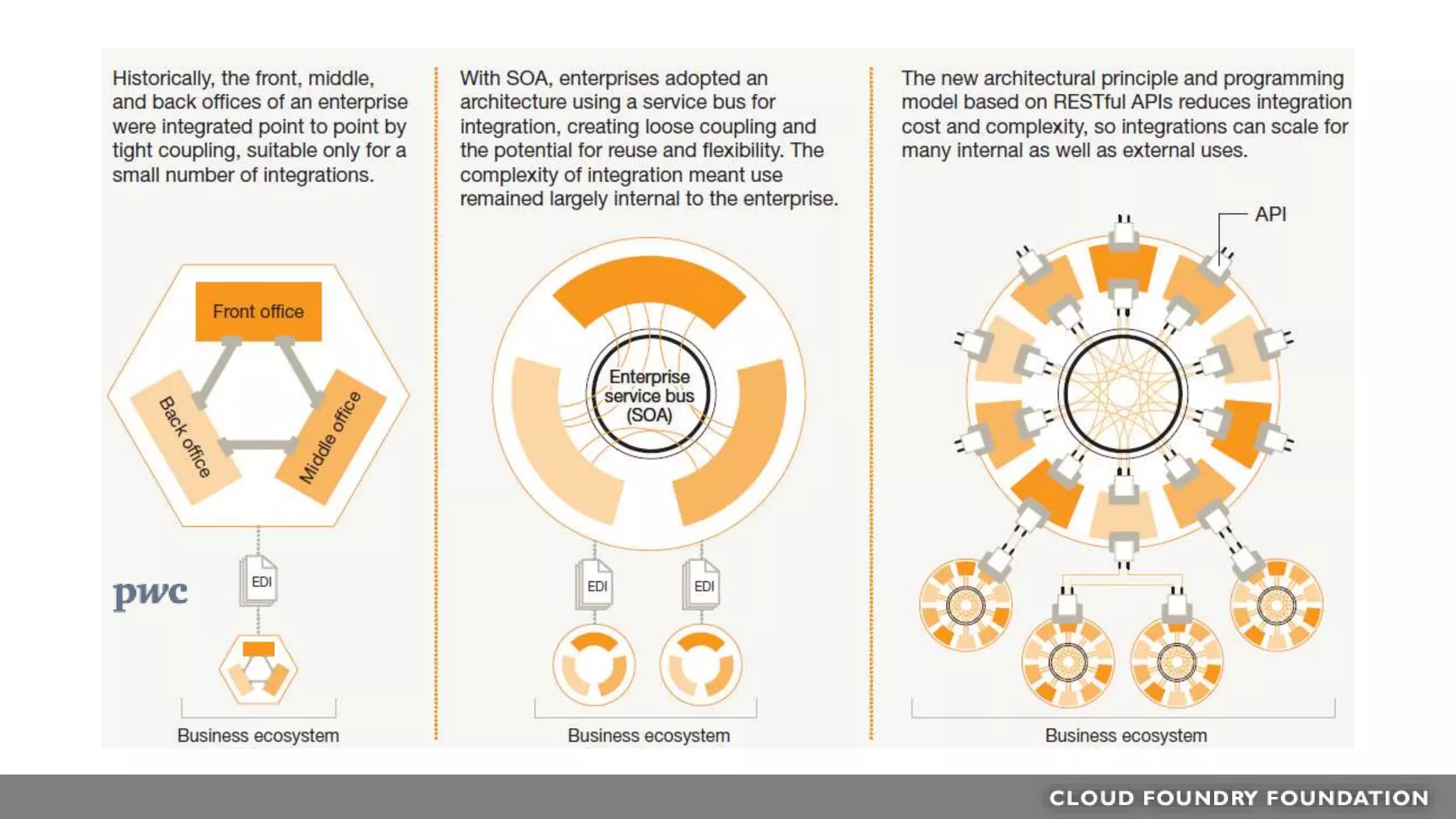 The document discusses the importance of continuous innovation and digital platforms in modern business, emphasizing the shift towards cloud-native applications and continuous delivery of value. It highlights the need for organizations to adopt an API-centric architecture, as exemplified by companies like Amazon and AT&T, to facilitate communication and scalability. Additionally, it outlines the significance of platform business models that leverage network effects and openness to drive profitability and foster digital ecosystems.