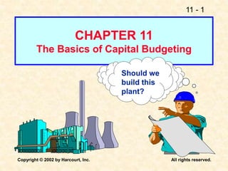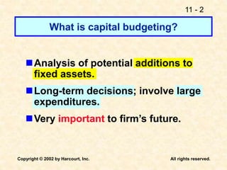 This document discusses capital budgeting and the key concepts involved. It defines capital budgeting as the analysis of potential additions to fixed assets involving large long-term expenditures that are important to a firm's future. The document outlines the steps in capital budgeting as estimating cash flows, assessing risk, determining the weighted average cost of capital, and using net present value or internal rate of return methods. It also discusses the differences between independent and mutually exclusive projects and provides examples to illustrate capital budgeting methods and decisions.