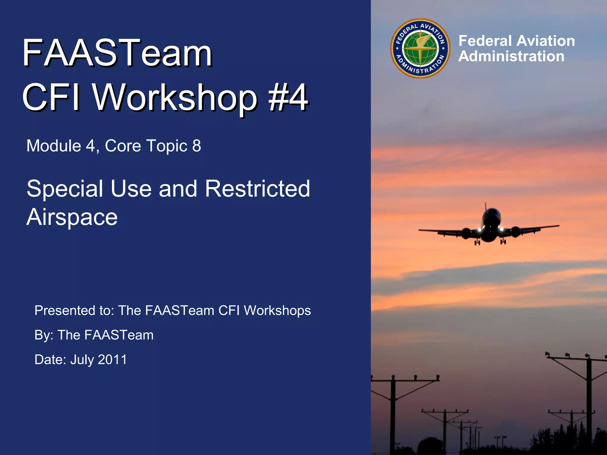 The document provides information on special use and restricted airspace for the FAASTeam CFI Workshop. It discusses different types of special use airspace like restricted areas, prohibited areas, military operation areas, and alert areas. It emphasizes the importance of checking NOTAMs for information on temporary flight restrictions and other notices that could impact flight planning. Pilots are advised to get thorough preflight briefings from sources like Flight Service to be aware of any airspace restrictions or hazards.
