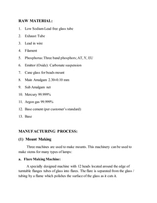 Compact fluorescent lamps (CFLs) provide 3.5 times as much light per watt as incandescent lamps, have much longer lifespans of 6,000-15,000 hours compared to 750-1,000 hours, and are often less costly than incandescent lamps. CFL production involves four main stages: mount making using automatic machinery to form stems; glass tube preparation including washing, coating, and baking; base preparation by mixing cement and filling bases; and final assembly of mounts, tubes, and bases. CFLs use 20-33% of the power of equivalent incandescent lamps for the same light output and are commonly used in offices, factories, and public buildings to reduce energy